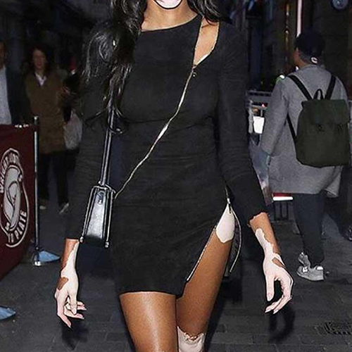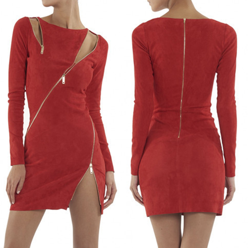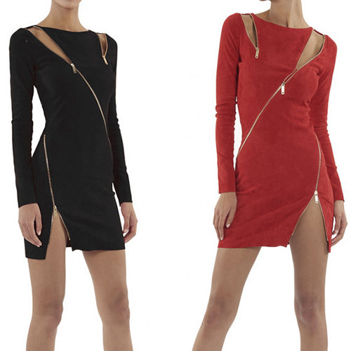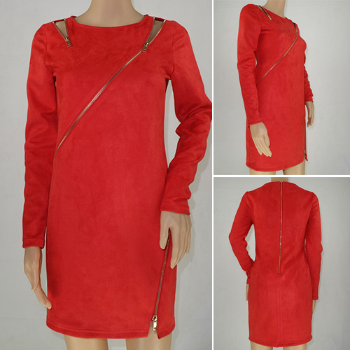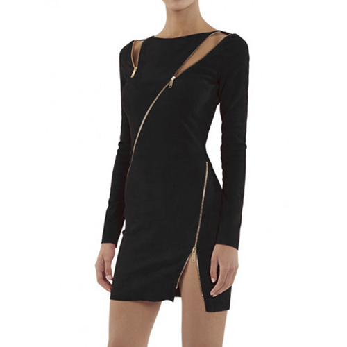 long sleeve and round neck, this dress is completed with oblique zipper and side zipper slit design, which