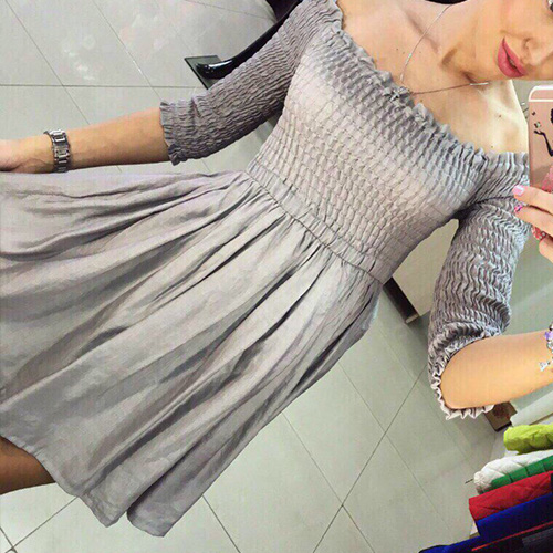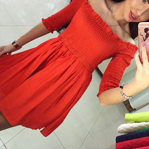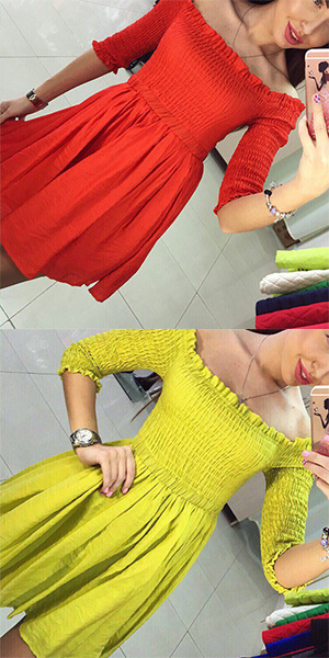 Achieve your sweet dating with this dress. It boasts off shoulder, half sleeve and gathered