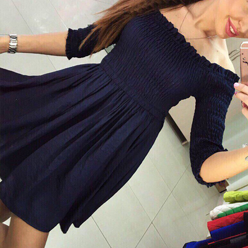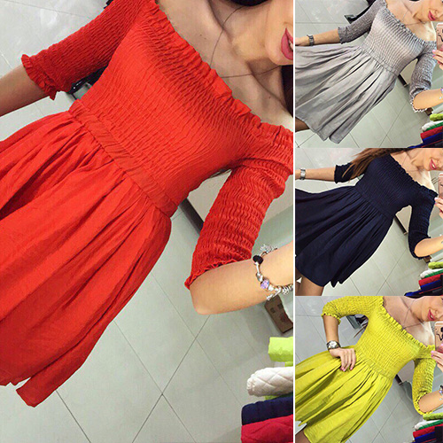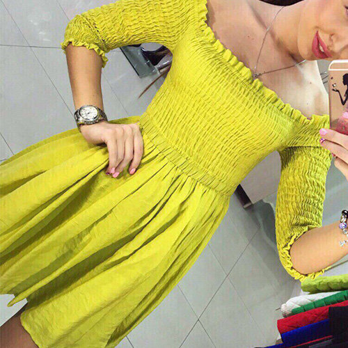 Sexy Solid Color Off Shoulder Half Sleeve Crinkle Gathered Waist Dress
