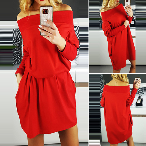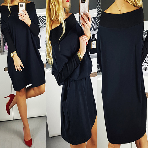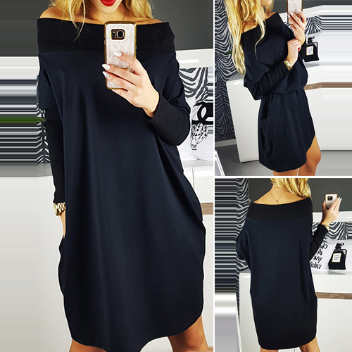 Off shoulder construction, owning solid color, long sleeve and loose silhouette, this dress plays its role in bring