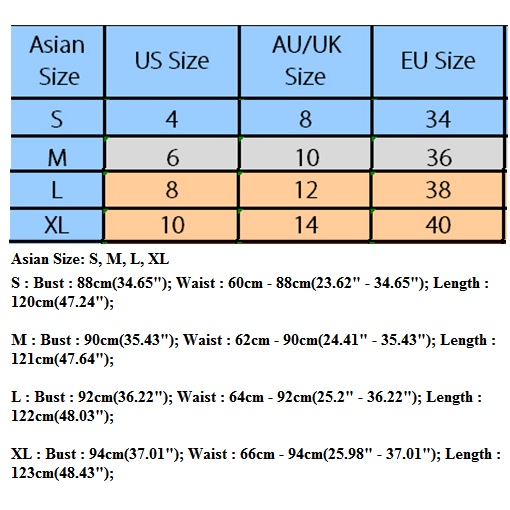 XL : Bust : 94cm(37.01"); Waist : 66cm - 94cm(25.98" - 37.01"); Length : 123cm(48.43");