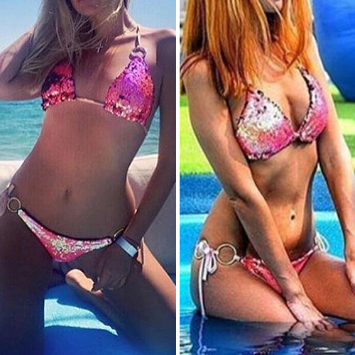 This bikini set is sure to make you be the focus on the beach. Halter style,its sequin design makes it look so