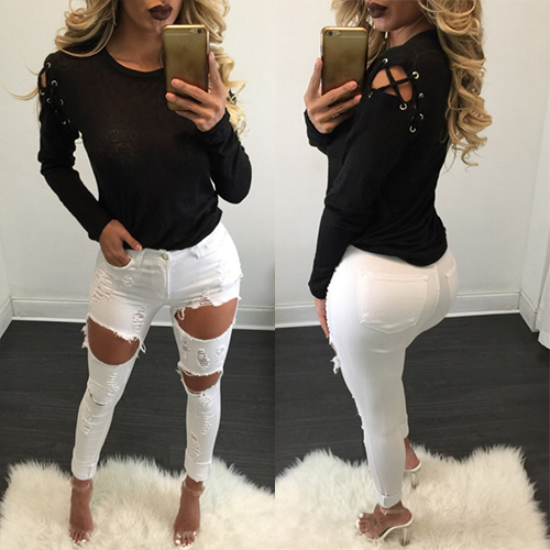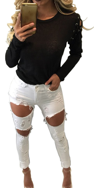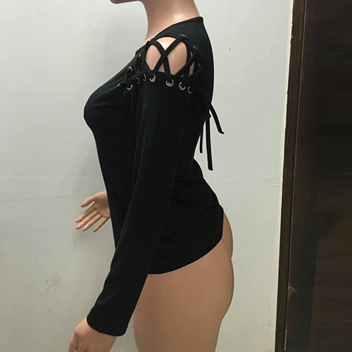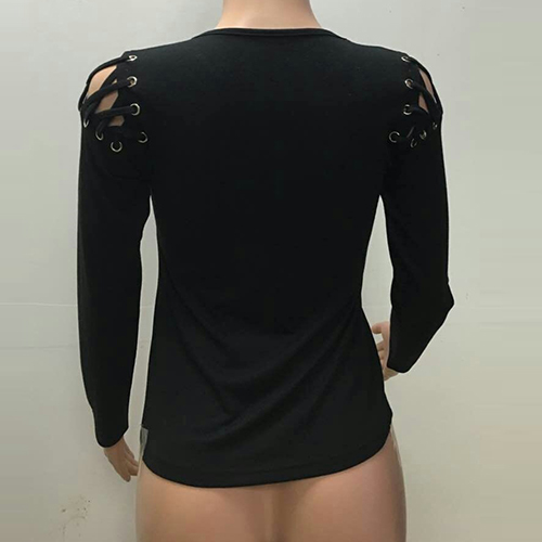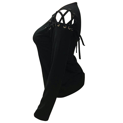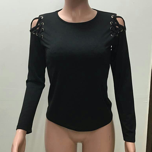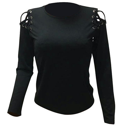 with a solid black hue, accompanied with round neck, long sleeve and shoulder with lace-up and hollow