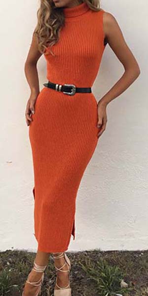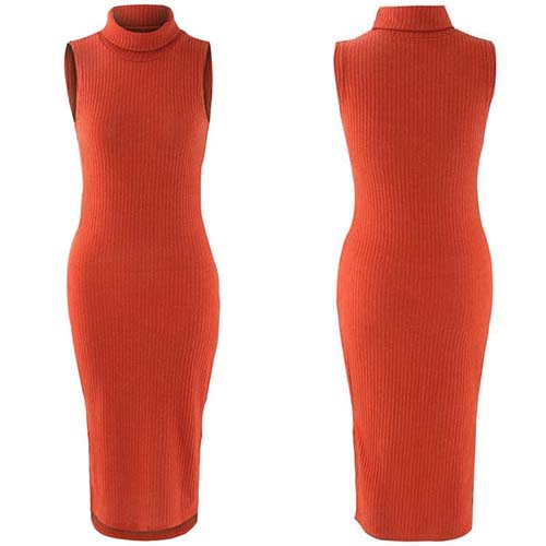 A slim fit style is paired with turtleneck, sleeveless and side slit design, which perfect shows your graceful