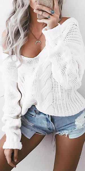Boasting a pure white color, with v-neck and long sleeve design, this sweater would bring your