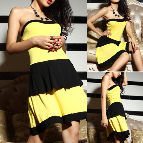Then we suggest you this dress! Strapless style,with contrast color design makes it look more eye-catching.