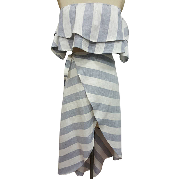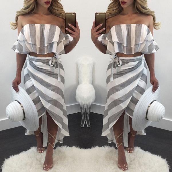 Looks extra charming with this two-piece set from day to night. Striped style,including a strapless crop top and a