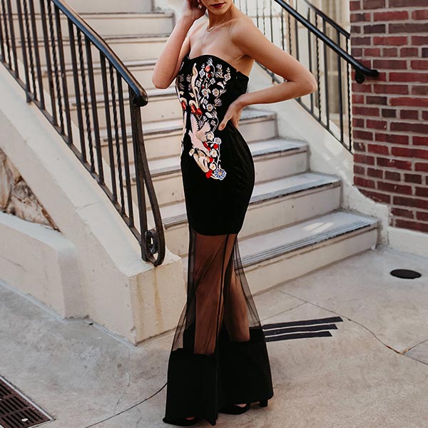 more attention. Strapless style,the see-through gauze spliced and embroidered design are the highlights,