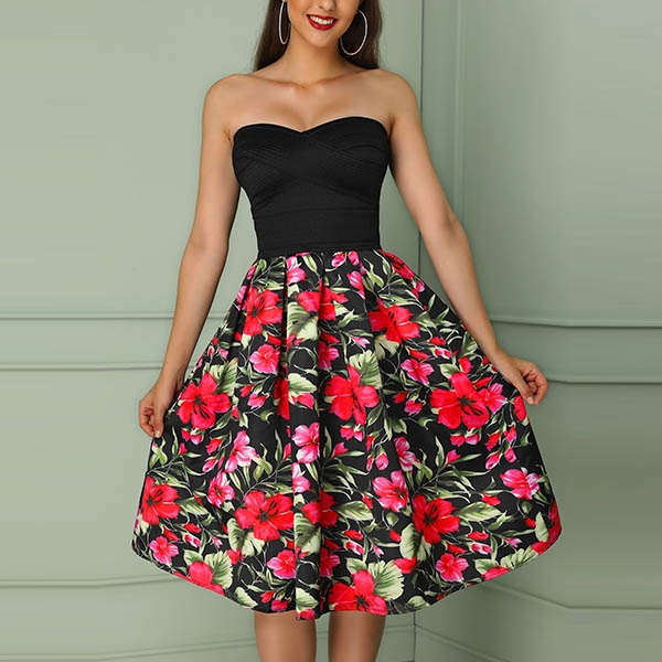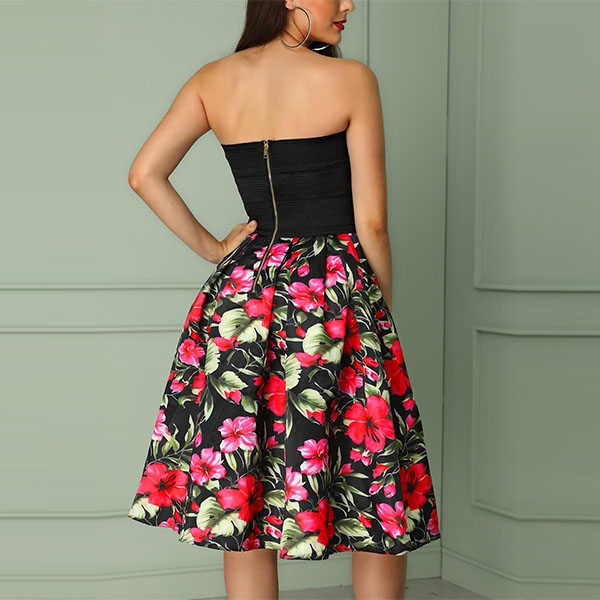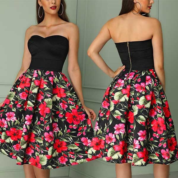 This flattering dress will certainly help you gain more compliments! Strapless style,the printed spliced