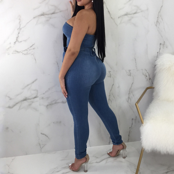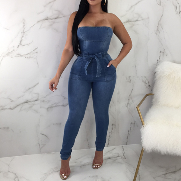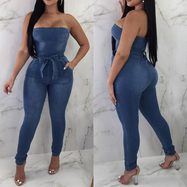 It is a good chance to showcase your charming curve through this denim jumpsuit. Strapless style,