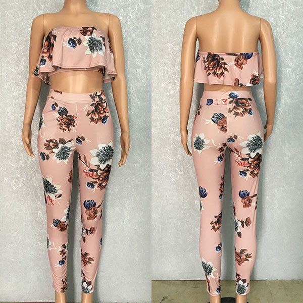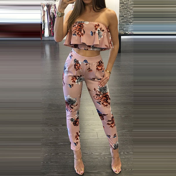 Features vibrant and romantic floral print,consists of a strapless ruffle crop top and a high waist pants,this two-piece set is a