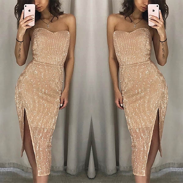 Wanna a sexy and charming evening look? Then throw yourself into this party dress! Strapless and slit