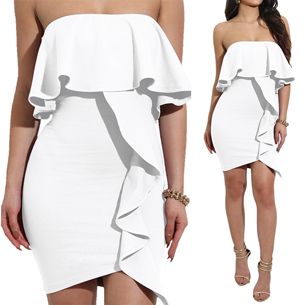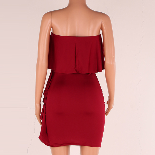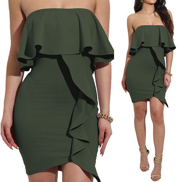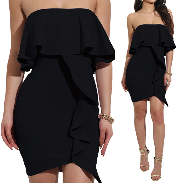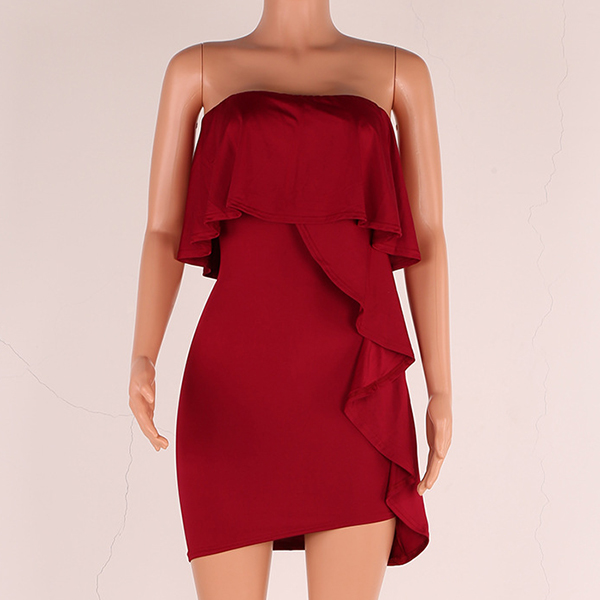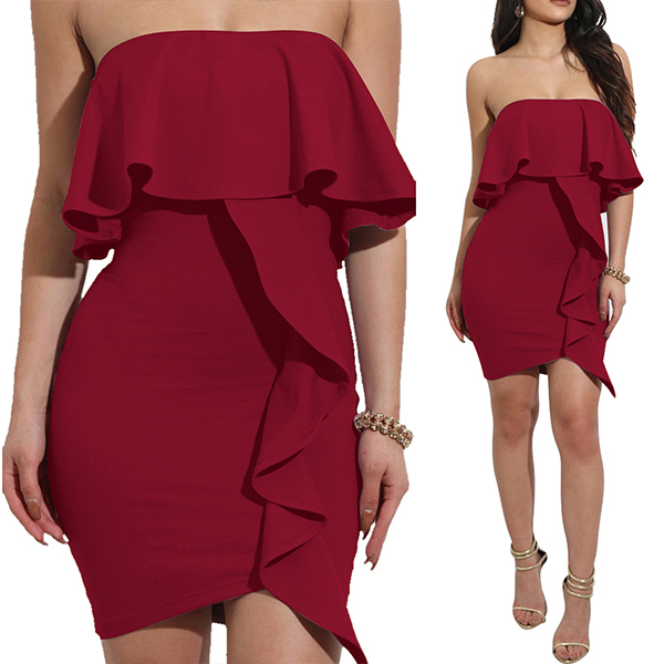 on hand. The solid color tone is designed for an elegant vibe,while the strapless,fit silhouette,irregular hem and ruffle