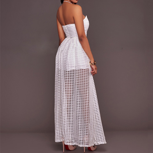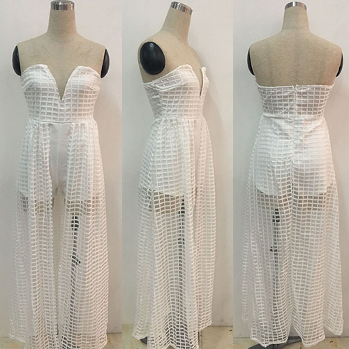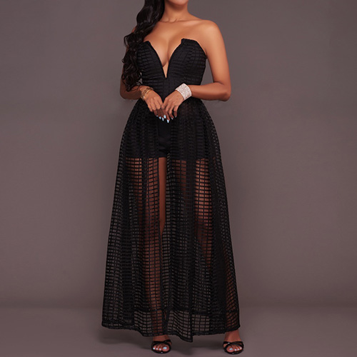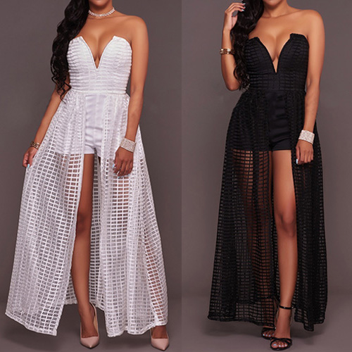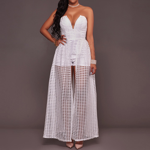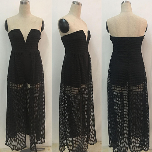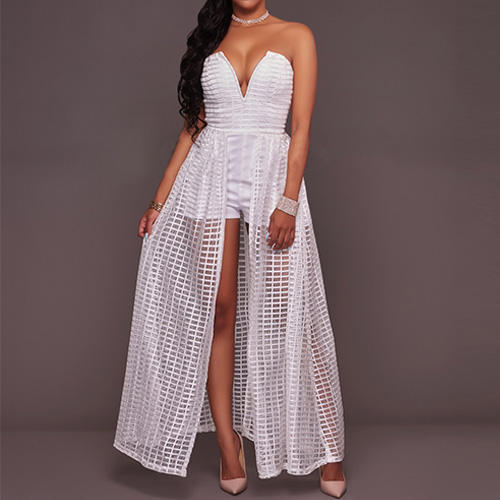 Strapless style,designed with a v-neck and gauze spliced hem,this alluring romper is sure to make you t be the focus. Adding a
