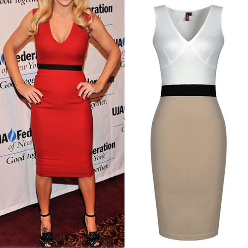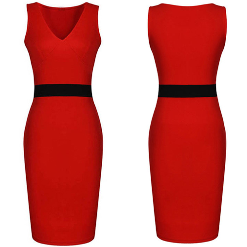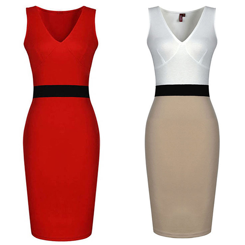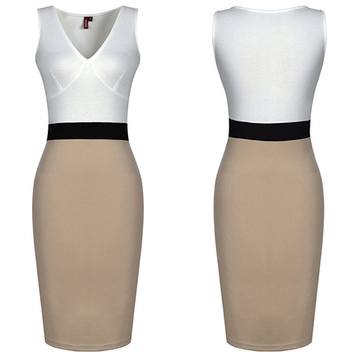 This piece of bodycon dress is colorblocked and it is styled with a v neckline and a sleeveless design,
