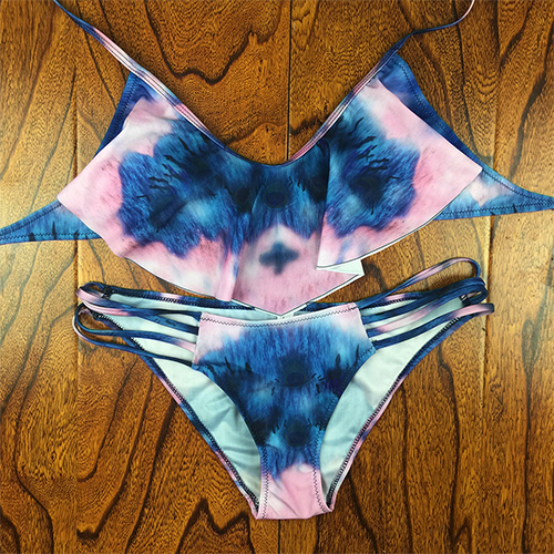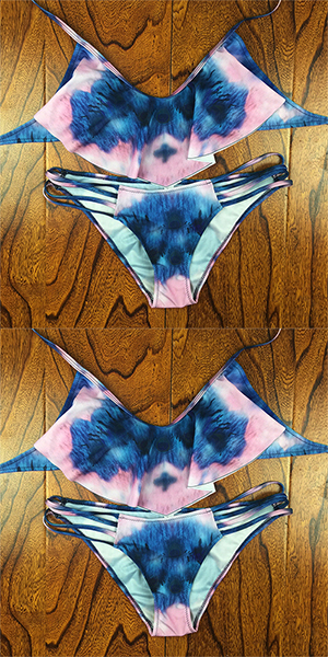 Its tie-dye printed design makes this bikini set look so chic and eye-catching. Lace-up halter design