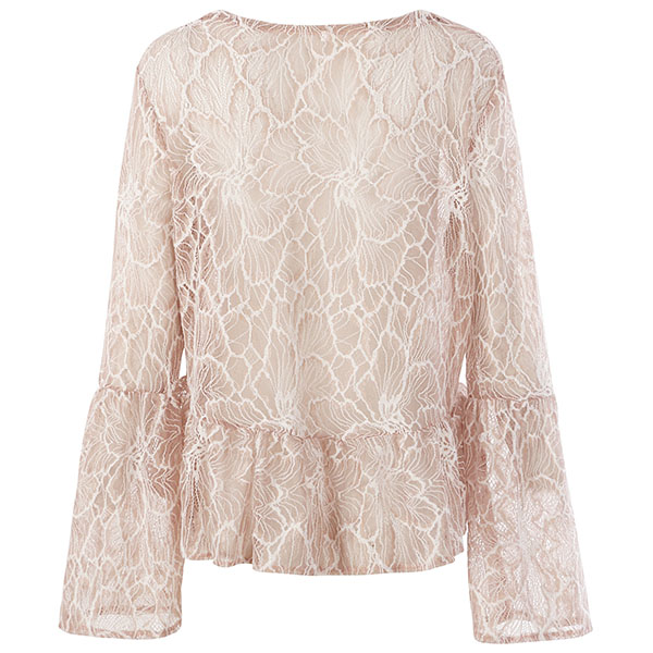 See-through style design makes it look so alluring. Finished with trumpet sleeve,round neck and ruffle hem