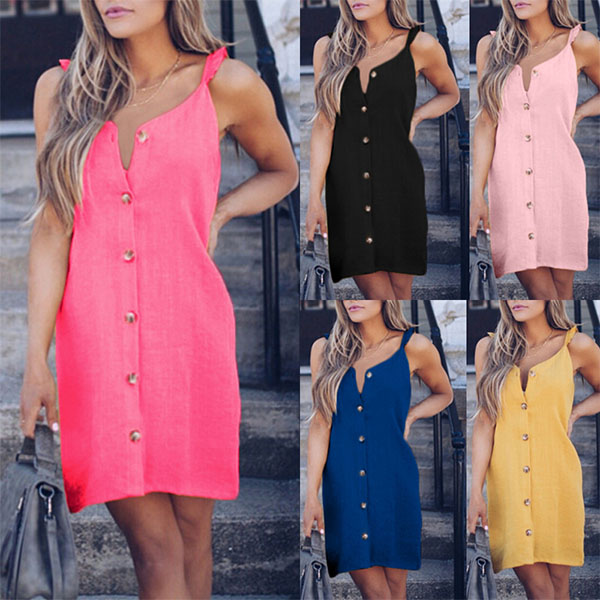 feature a shift silhouette with button front design, a ruffled accent at the shoulder strap, V-neckline,