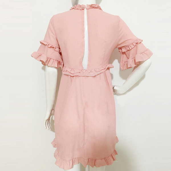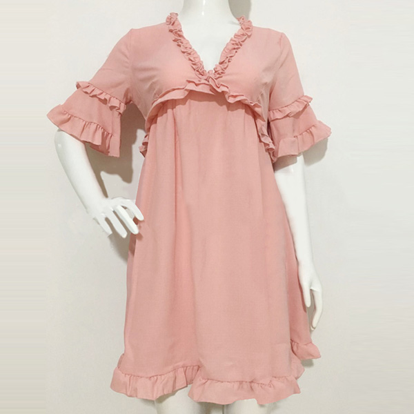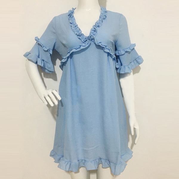 a short sleeve and a flowing hemline with ruffled trim detail, a ruffle trim throughout V-neckline to an