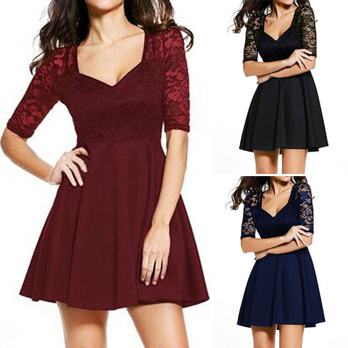 Exude a feminine look when you slip into this dress. See-through lace spliced style,designed with half sleeve,v-neckline and a high waistline,this