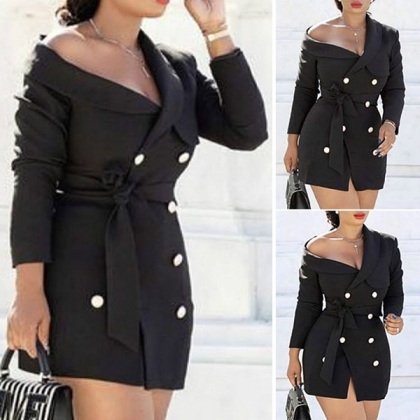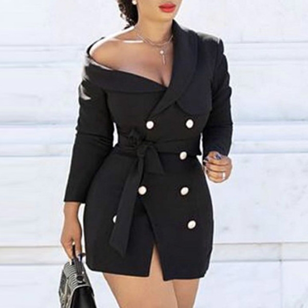 black tone,with long sleeve,v-neck and double-breasted design,coming with a waist strap design can