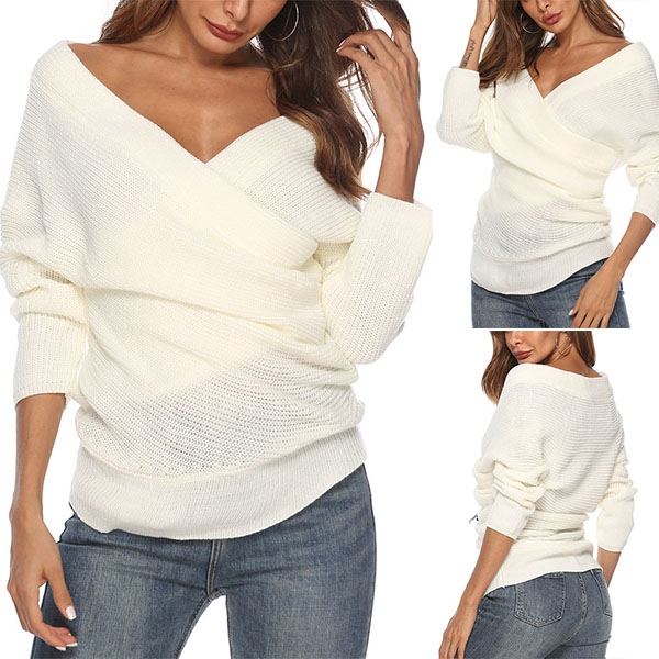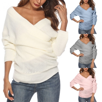 Sexy V-neck Long Sleeve Solid Color Sweater