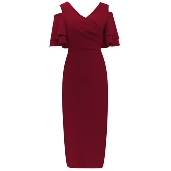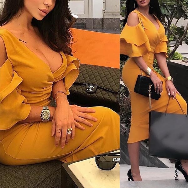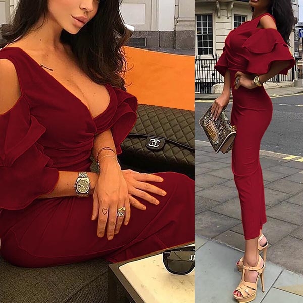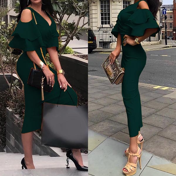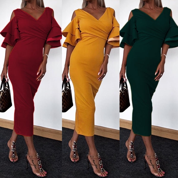 have this delicate dress in your wardrobe. Comes with a solid color tone,the v-neck and lotus sleeve