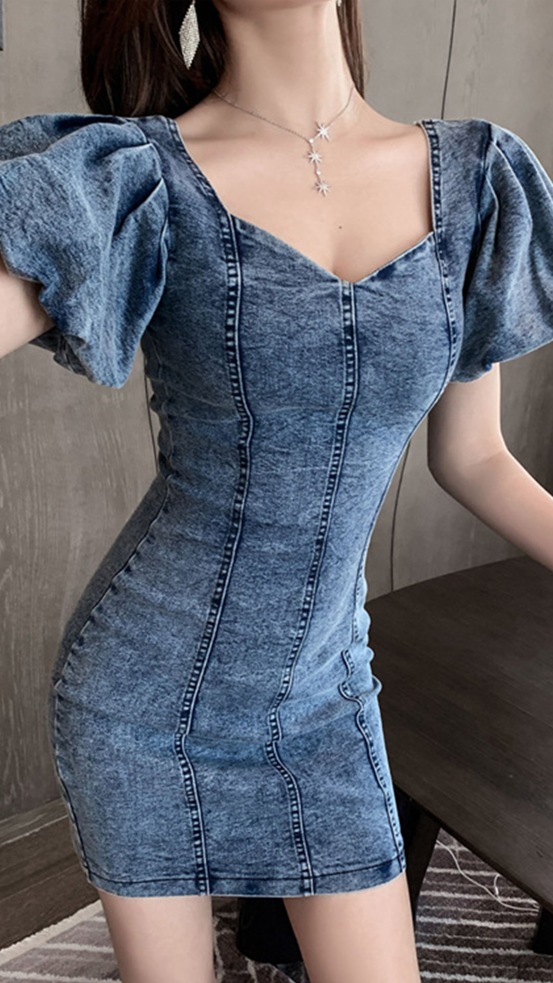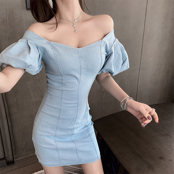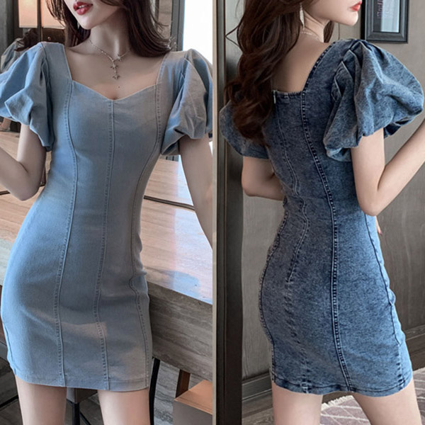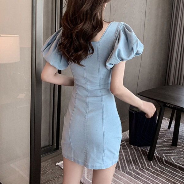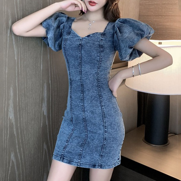 slip into this breathtaking denim dress. Its puff sleeve and v-neck design can exude your feminine