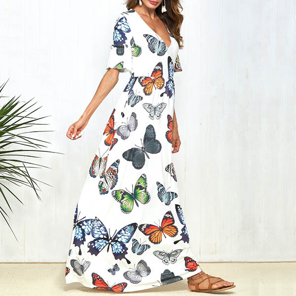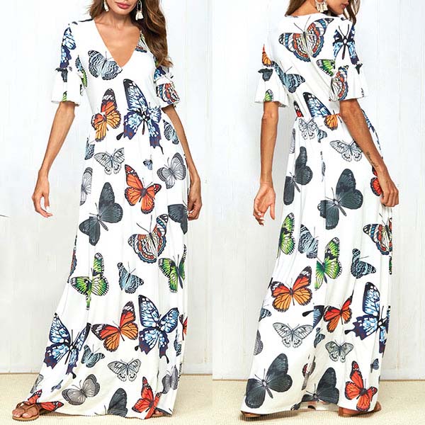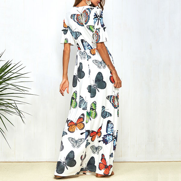 Embrace the sun-soaked weekends with this beautiful dress. The butterfly printed design makes this piece