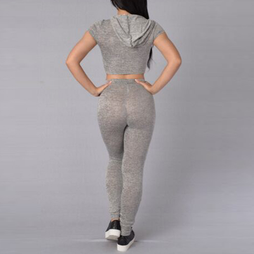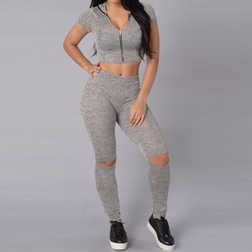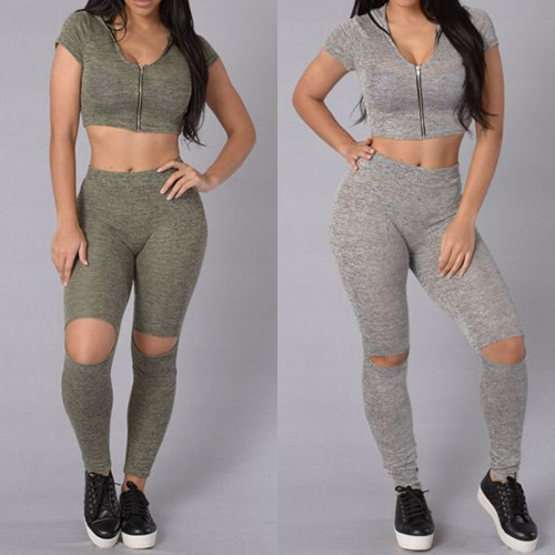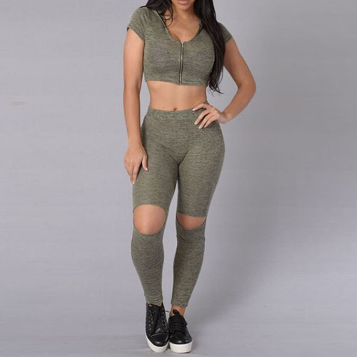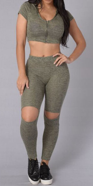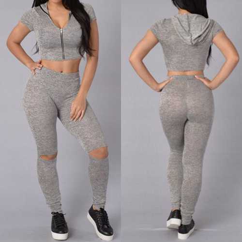 Solid color style,including a short sleeve v-neck hooded crop tops and a high waist ripped pants,this two-piece