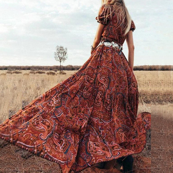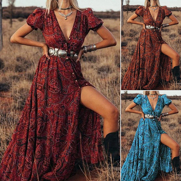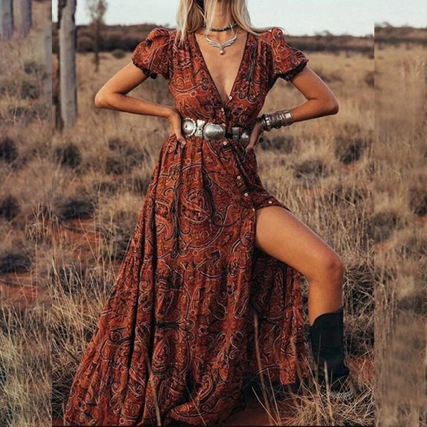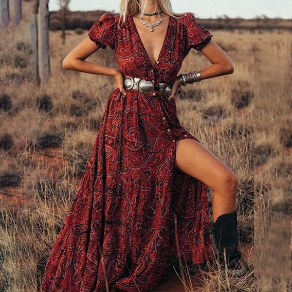 It is designed with chic and eye-catching printed details,with v-neck,high waist and a maxi length,