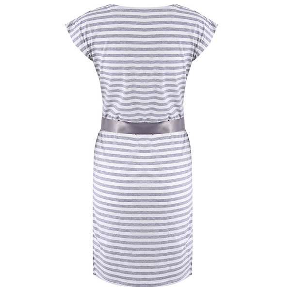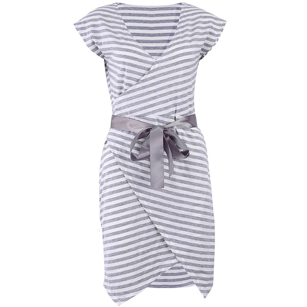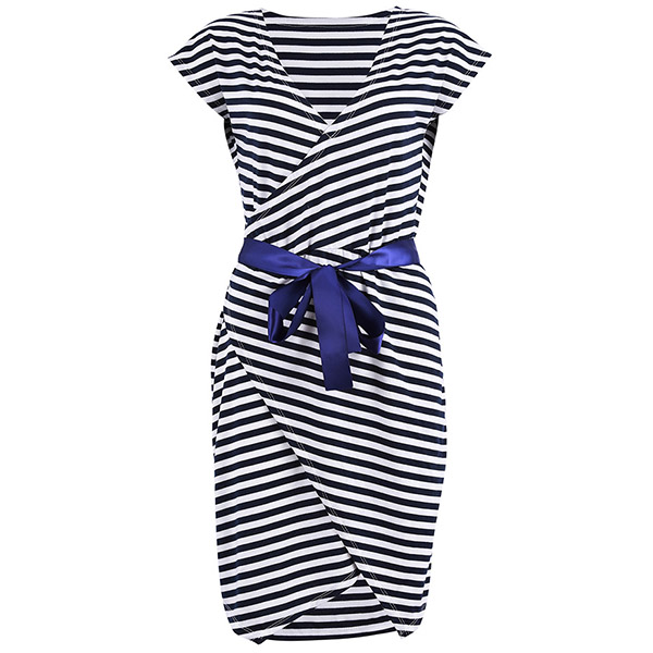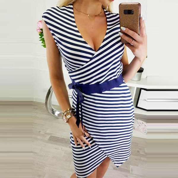 Designed with striped element,finished with sleeveless,v-neck,an irregular hem and a fit silhouette,this dress is a