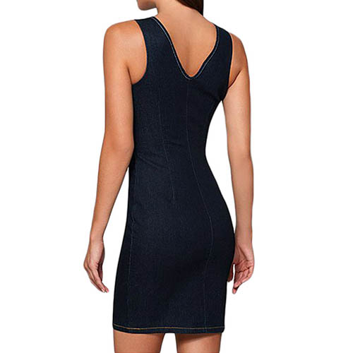 sleeveless,v-neckline,front zipper closure and a super fit silhouette,this denim dress is a