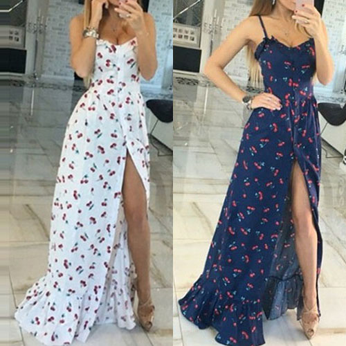 chic and sweet cherry printed details,its v-neckline and high slit hem design makes this piece more alluring. Just need to