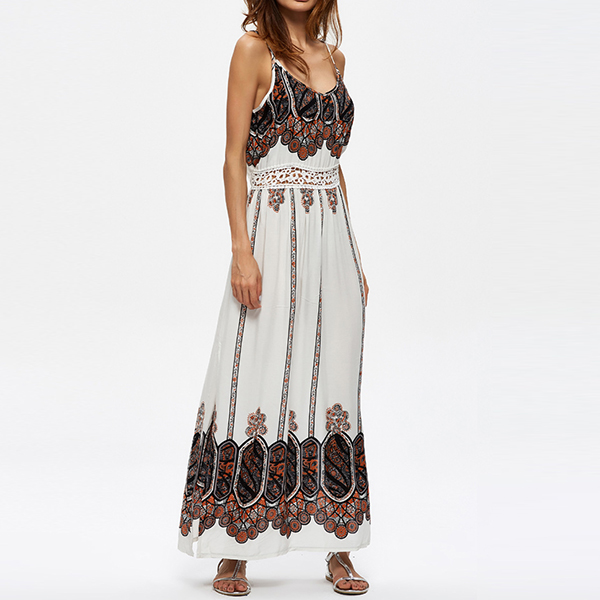 Sling style,its v-neck,slit hem and hollow out lace spliced design at waist makes this piece more feminine.