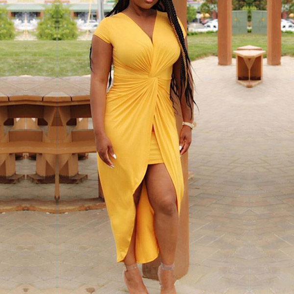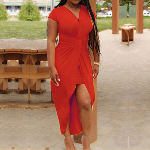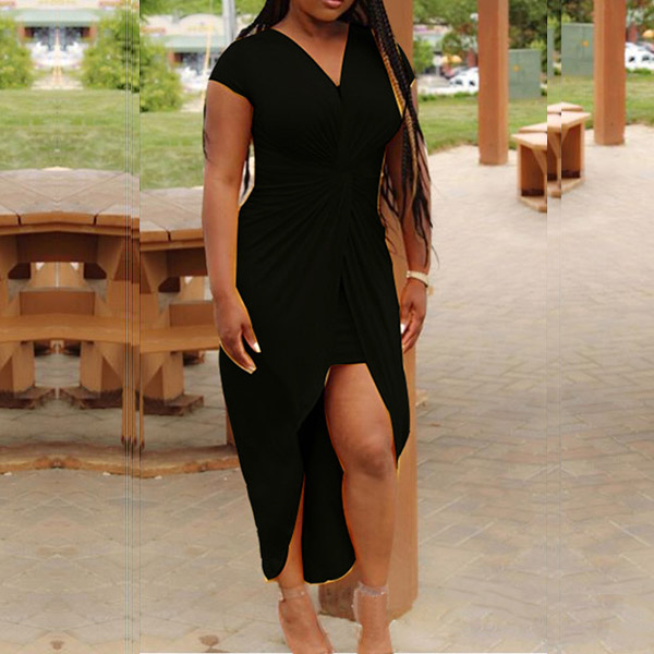 Sexy V-neck Slit Hem Short Sleeve Solid Color Twisted Dress