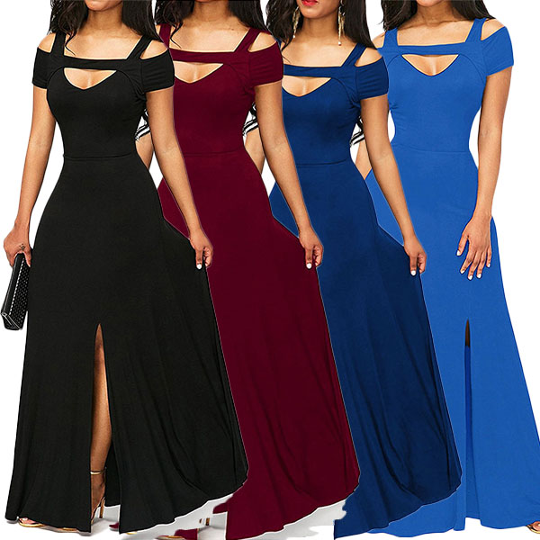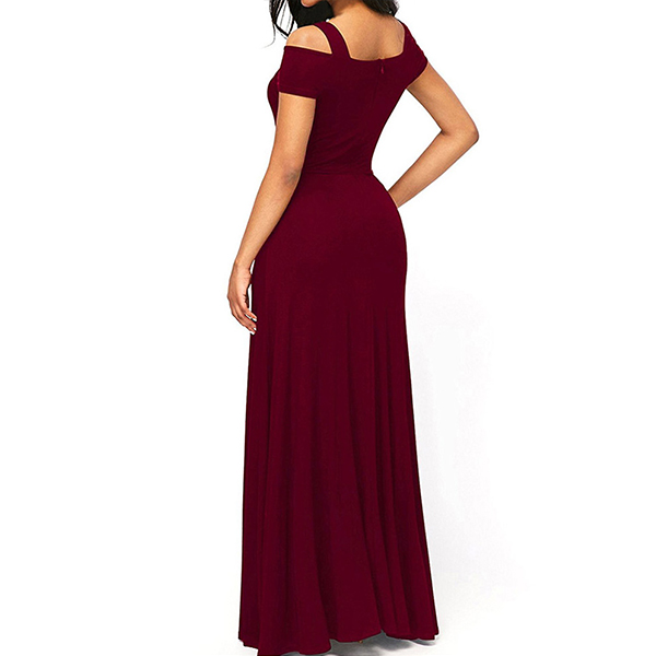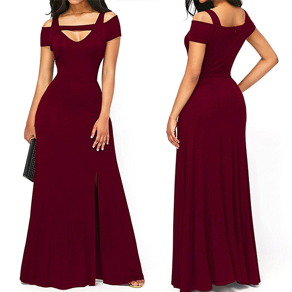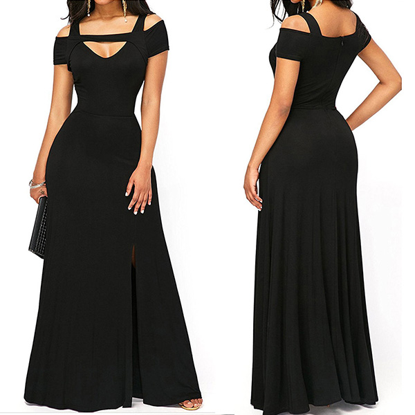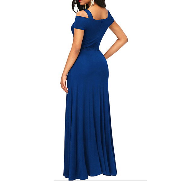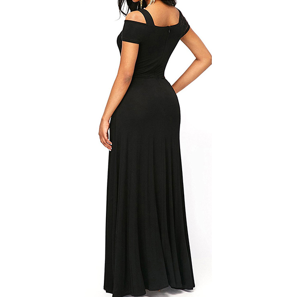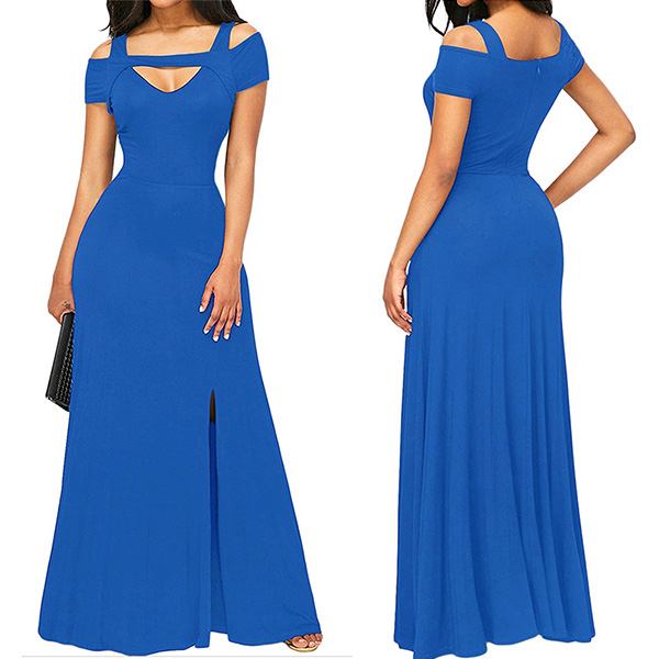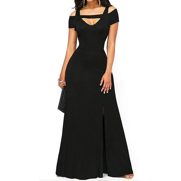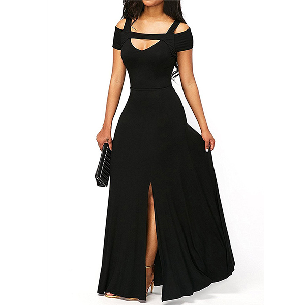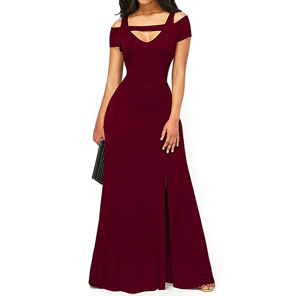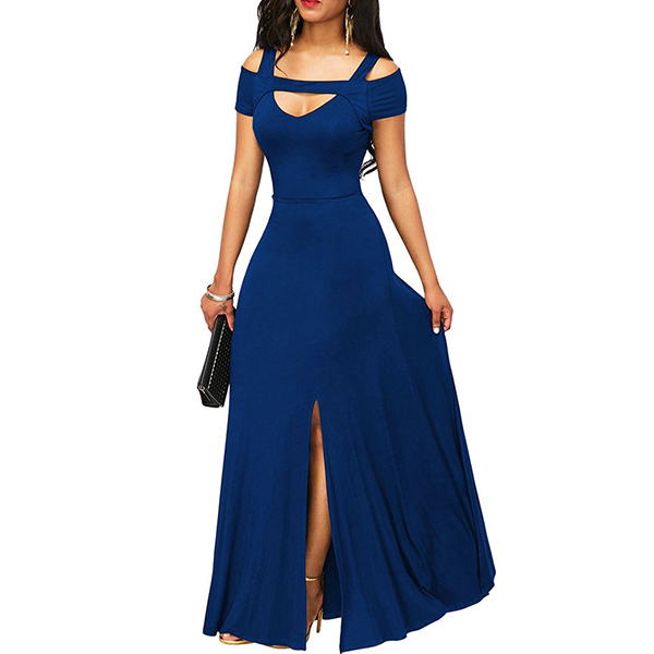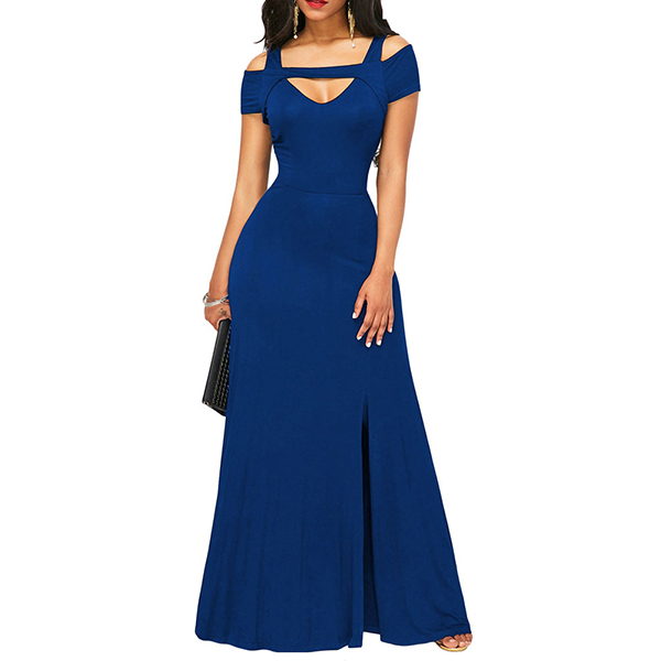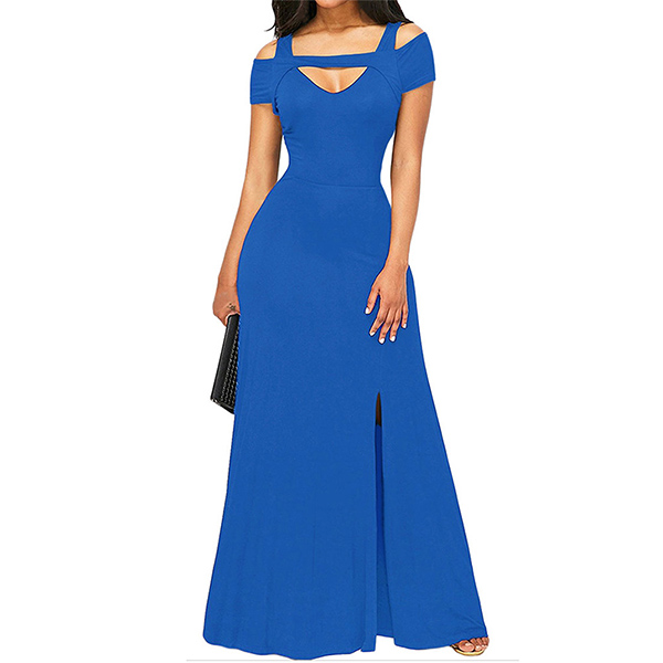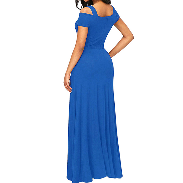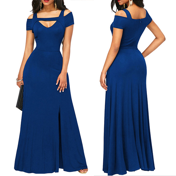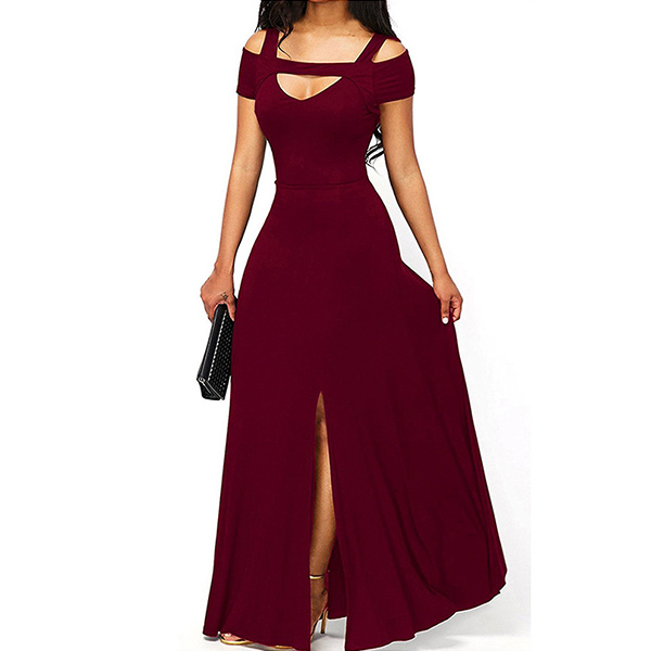 Sexy V-neck Solid Color Short Sleeve Hollow Out Long Slit Ruffle Hemline Dress