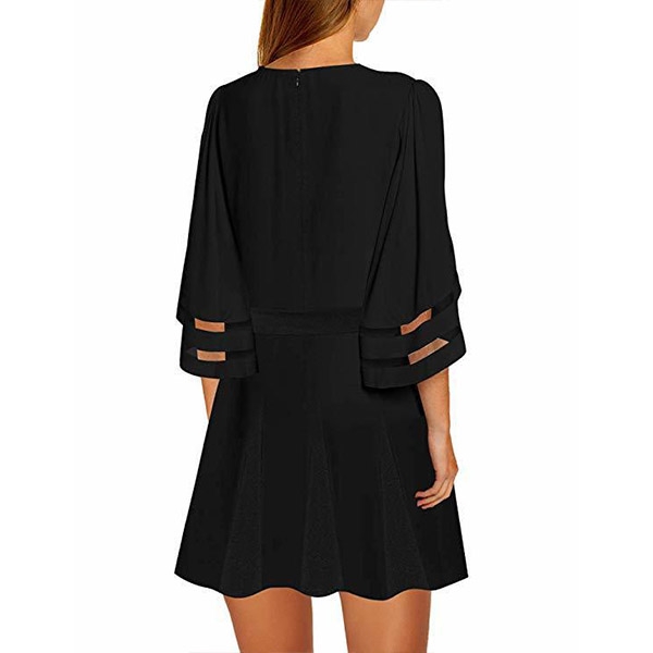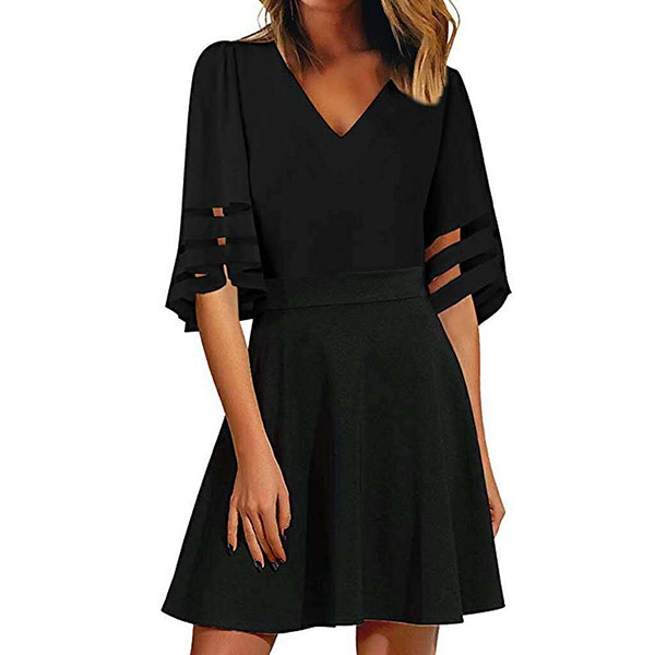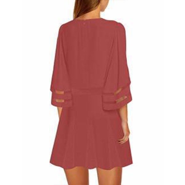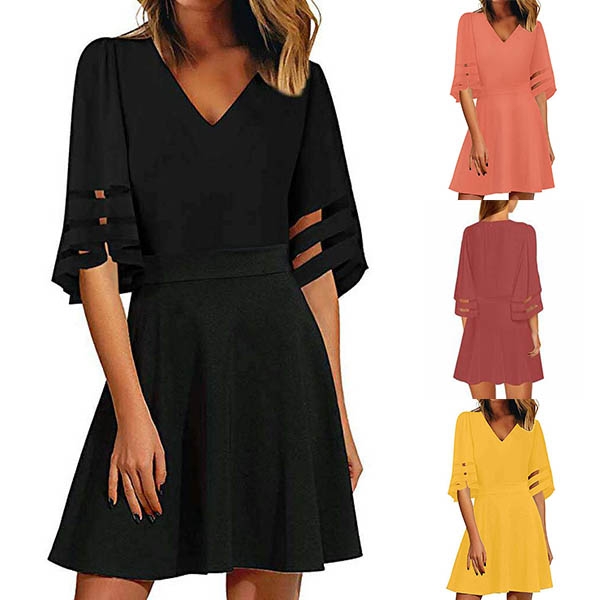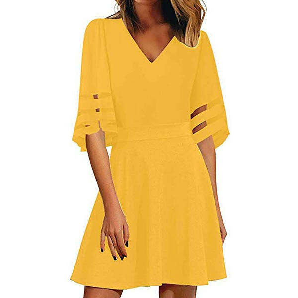 Crafted in a solid color,with v-neck,trumpet sleeve and high waist design,this dress can