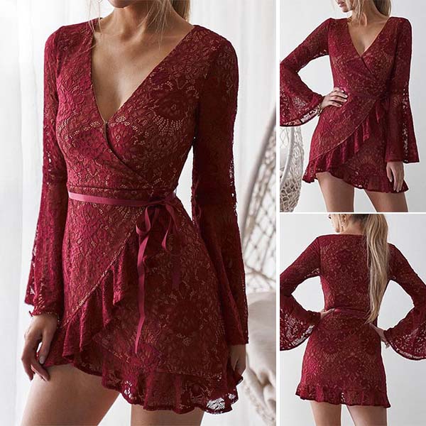 and charming side. Designed with trumpet sleeve,v-neck and irregular ruffle hem,this dress can maintain
