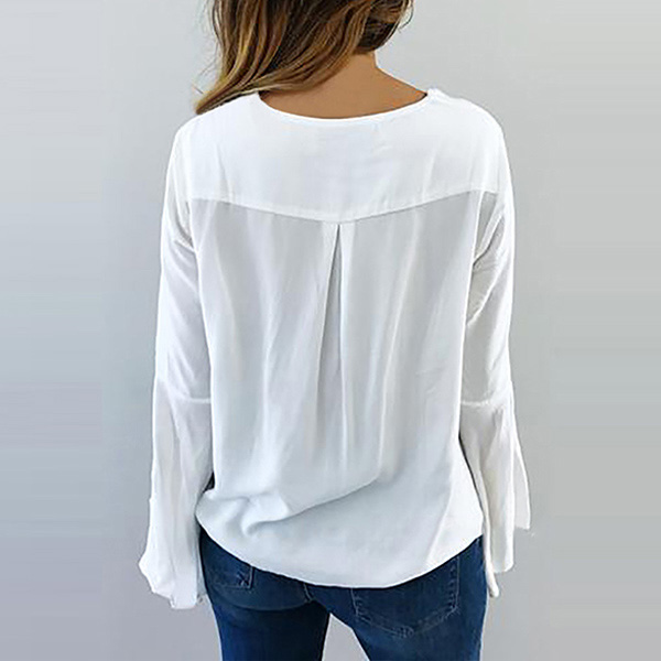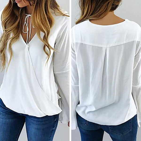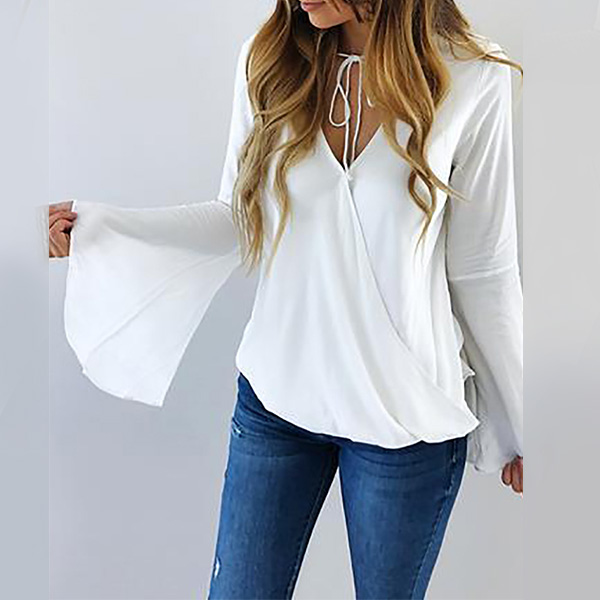 This chiffon blouse comes with a solid color,finished with trumpet sleeve and deep v-neck design,