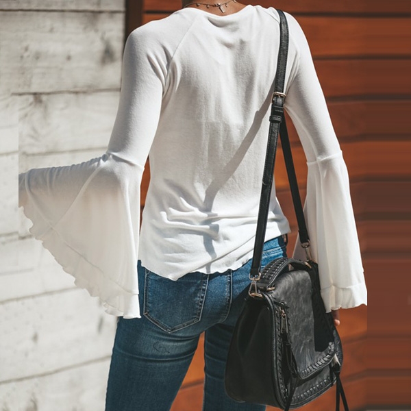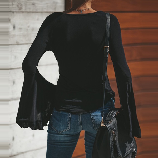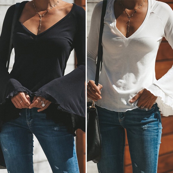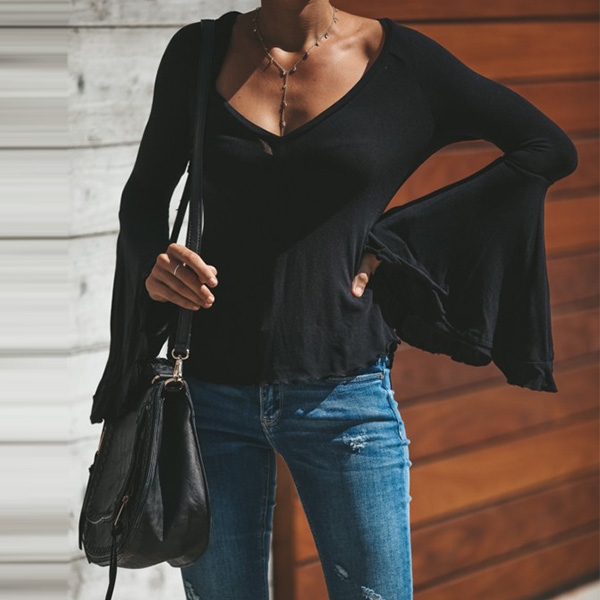 Update your wardrobe by adding this t-shirt. It boasts a solid color,the v-neck and trumpet sleeve design