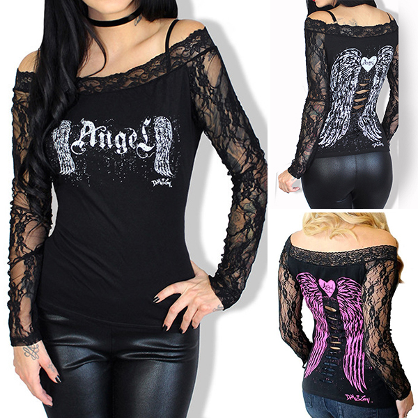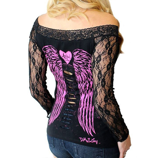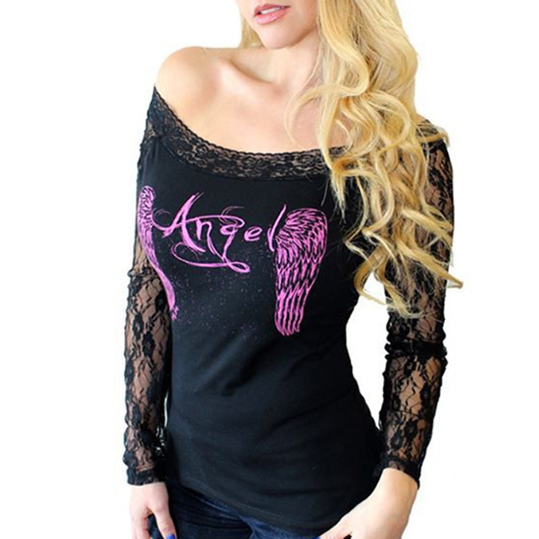 Such a chic and sexy t-shirt! Lace spliced style,designed with long sleeve,wide neckline and wings printed pattern,