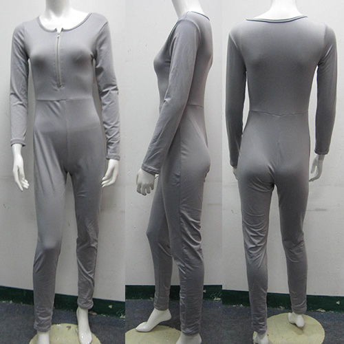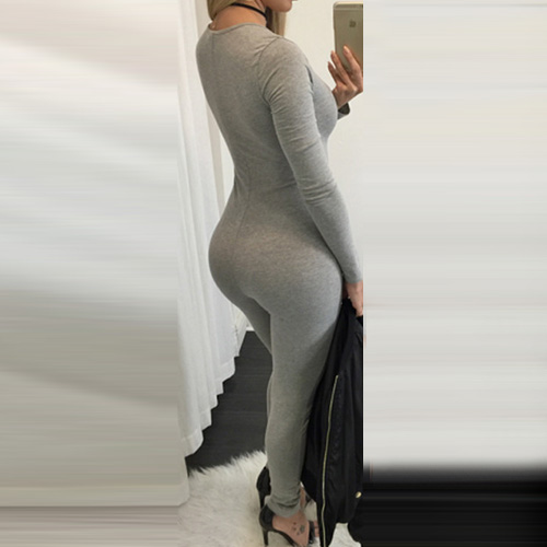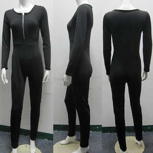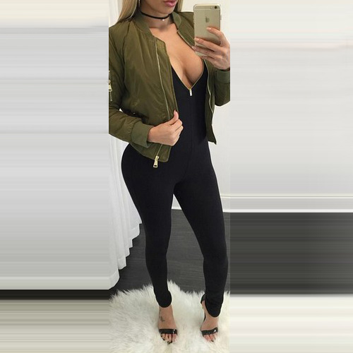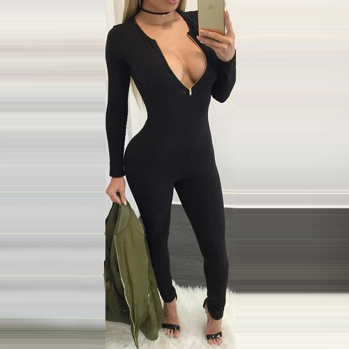 solid color style,neckline with zipper design makes it become a deep v-neck jumpsuit. And its super
