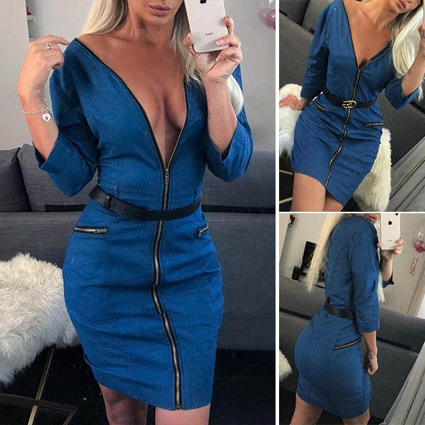 Sexy Zipper V-neck 3/4 Sleeve Slim Fit Denim Dress