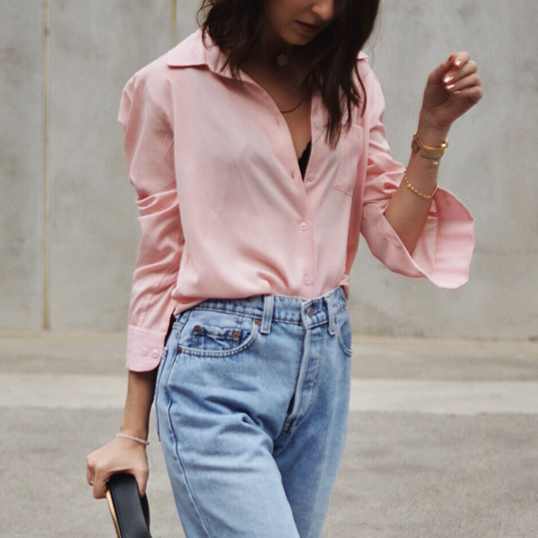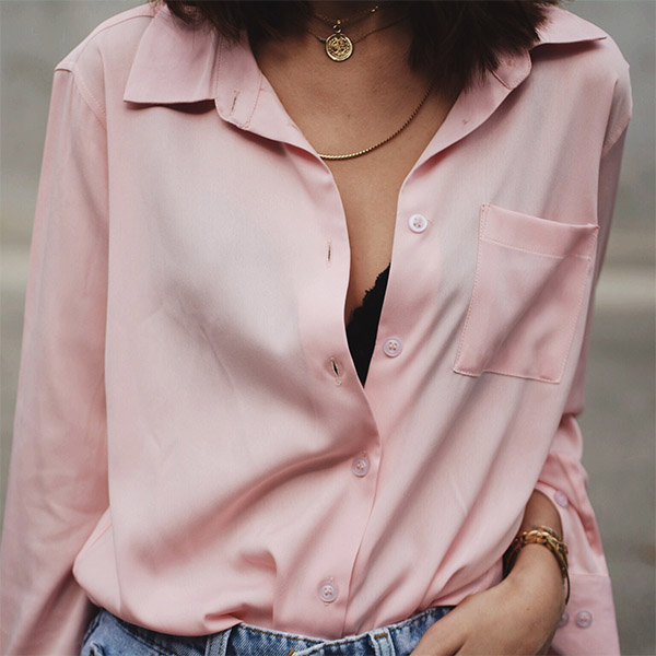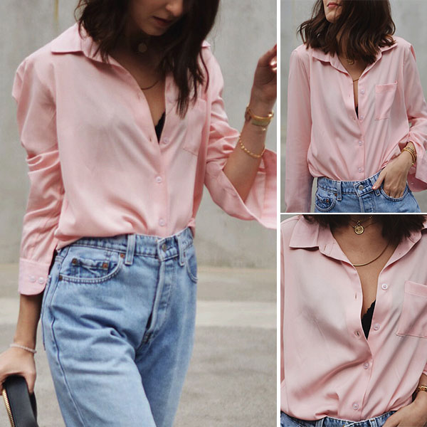 This shirt comes with a sweet pink tone,finished with long sleeve,POLO collar and single-breasted design,