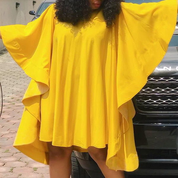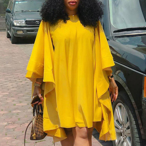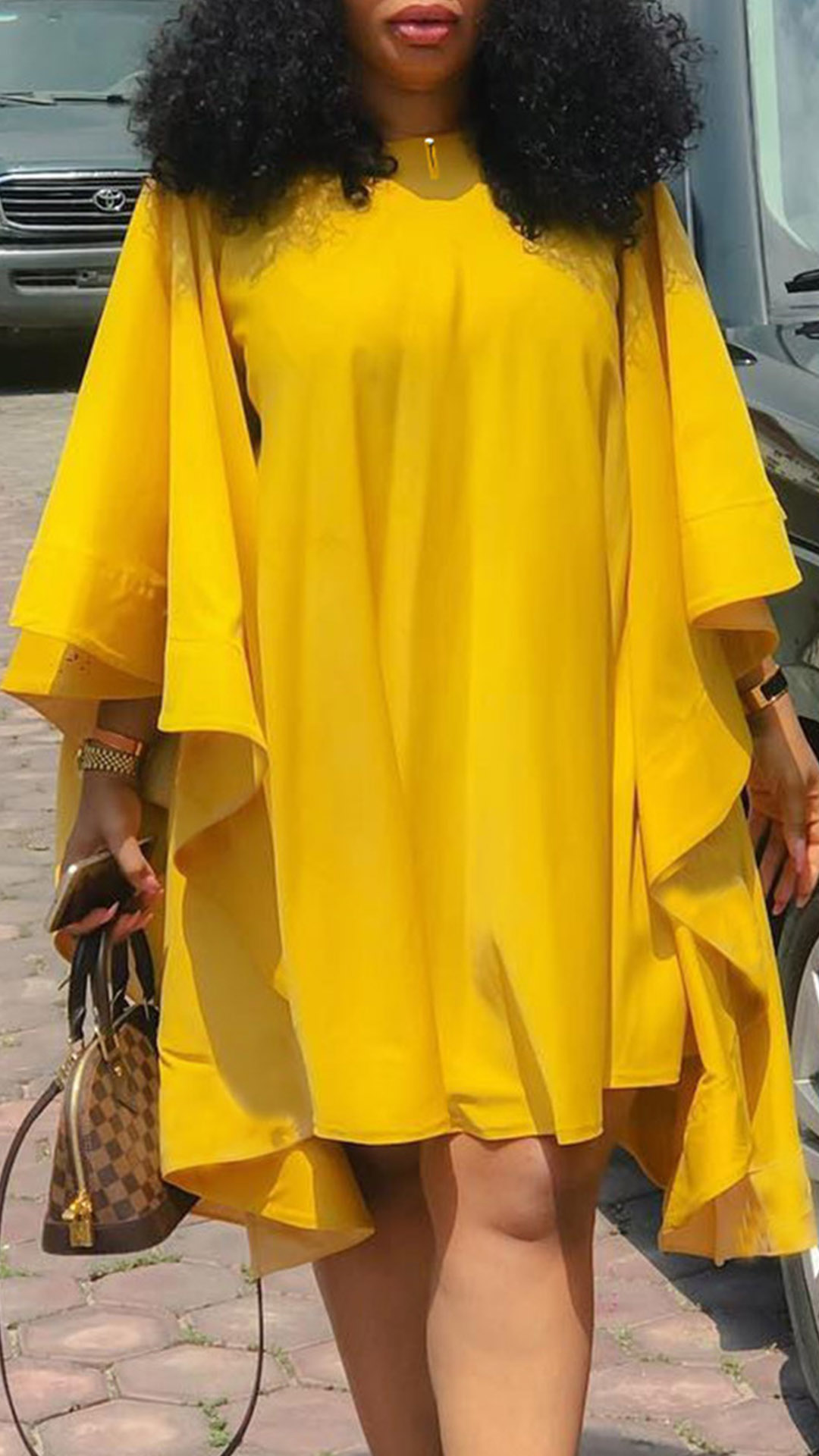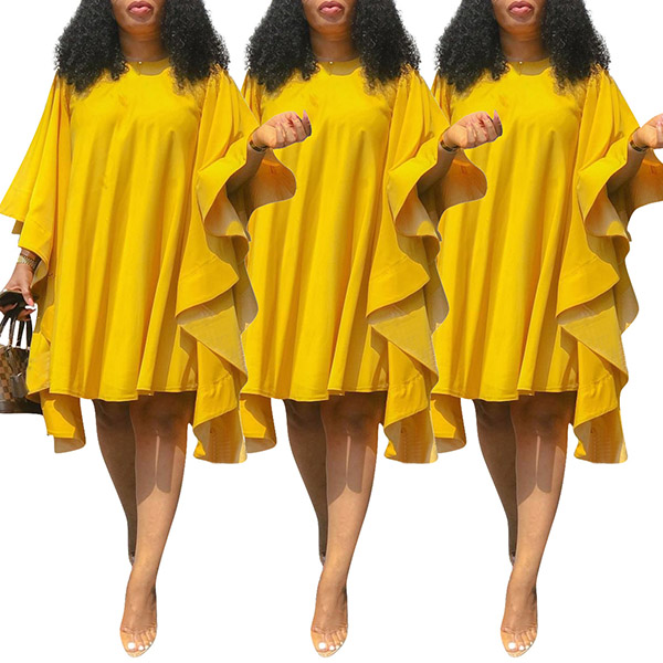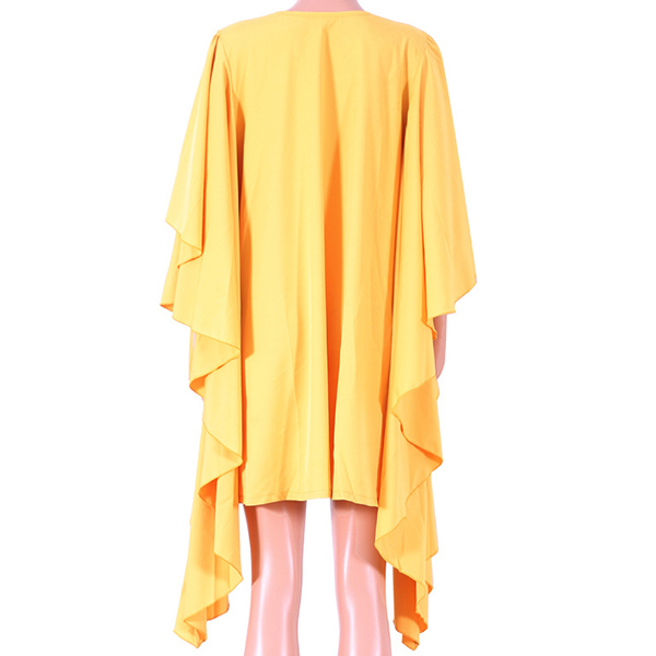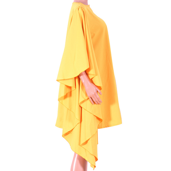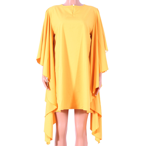 Stylish Solid Color Round Neck Cold Shoulder Ruffle Sleeve Irregular Hemline Dress