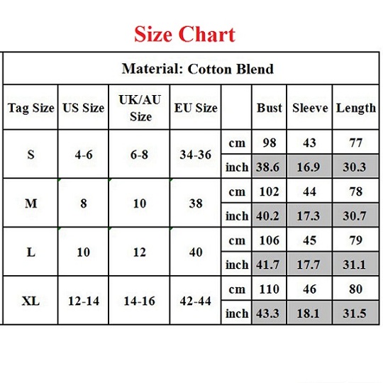XL : Bust : 110cm(43.31"); Sleeve : 46cm(18.11"); Length : 80cm(31.5");