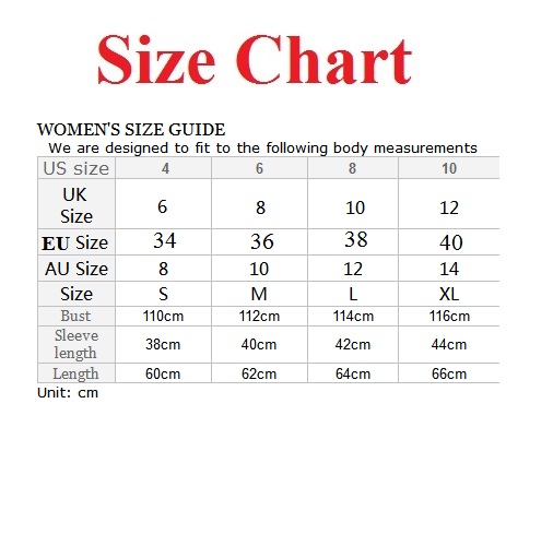 XL : Bust : 116cm(45.67"); Sleeve : 44cm(17.32"); Length : 66cm(25.98");