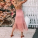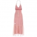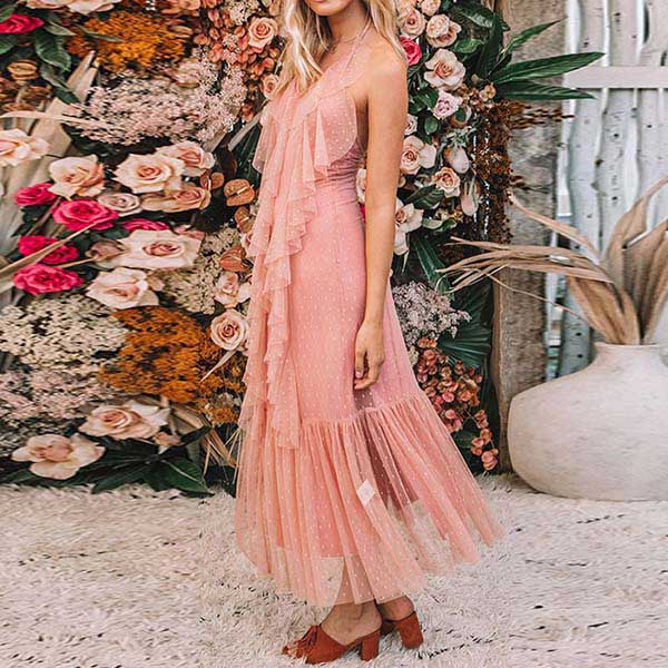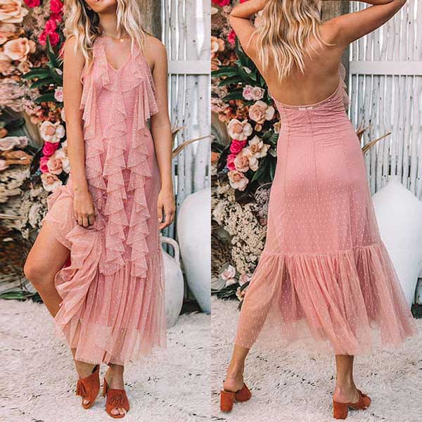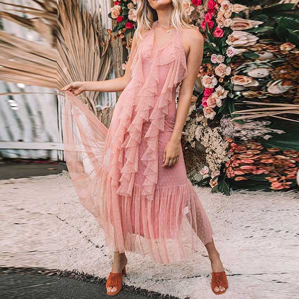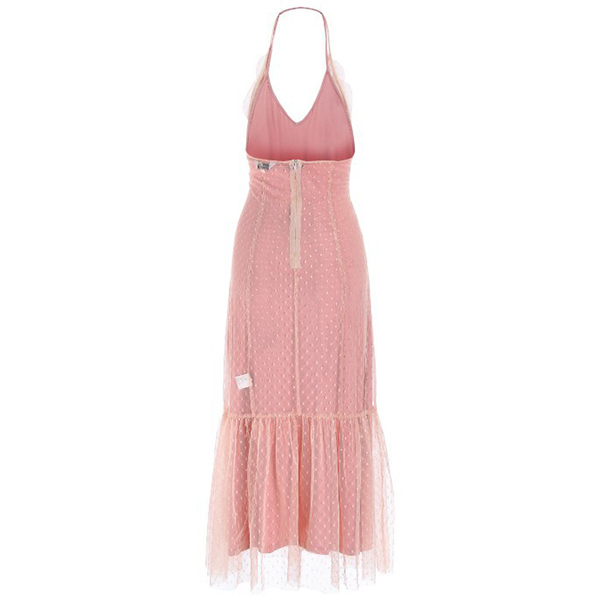 This sweet dress in woven fabric with gauze spliced and lotus hem.Halter design,a zipper at the back