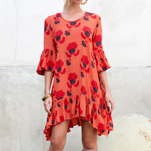 printed pattern,with 3/4 sleeve and round neck design,delicate yet stylish. And its ruffle details make this piece
